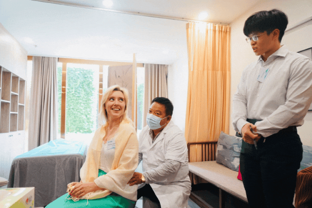 在国药国医馆(中医康养中心),欧洲外交官饶有兴趣地现场考察并体验中式保健