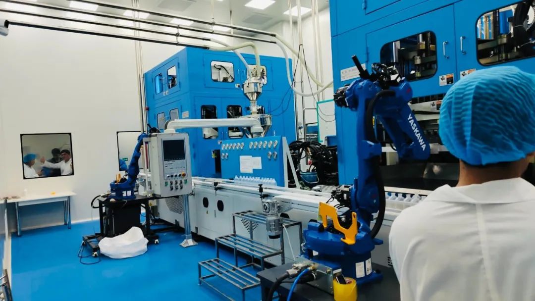 王亦俊介绍说,传统大输液瓶需要通过两台设备生产,第一步做瓶坯,第二步吹瓶,而来自中国新型一步法吹瓶设备+洗灌封联动一体化生产,使得生产环节大为缩短,成功避免因半成品周转引入的杂质,同时避免了二次加热而减少能耗,客户生产成本将大幅降低。