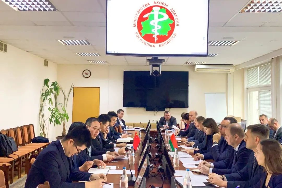 周颂一行在白卫生部与皮涅维奇及白经济部、财政部和相关企业负责人、专家代表举行会谈,双方就医疗器械、制药设备、原料药和制剂本地化生产、中医药、医院建设等领域合作项目进行深入沟通交流。
