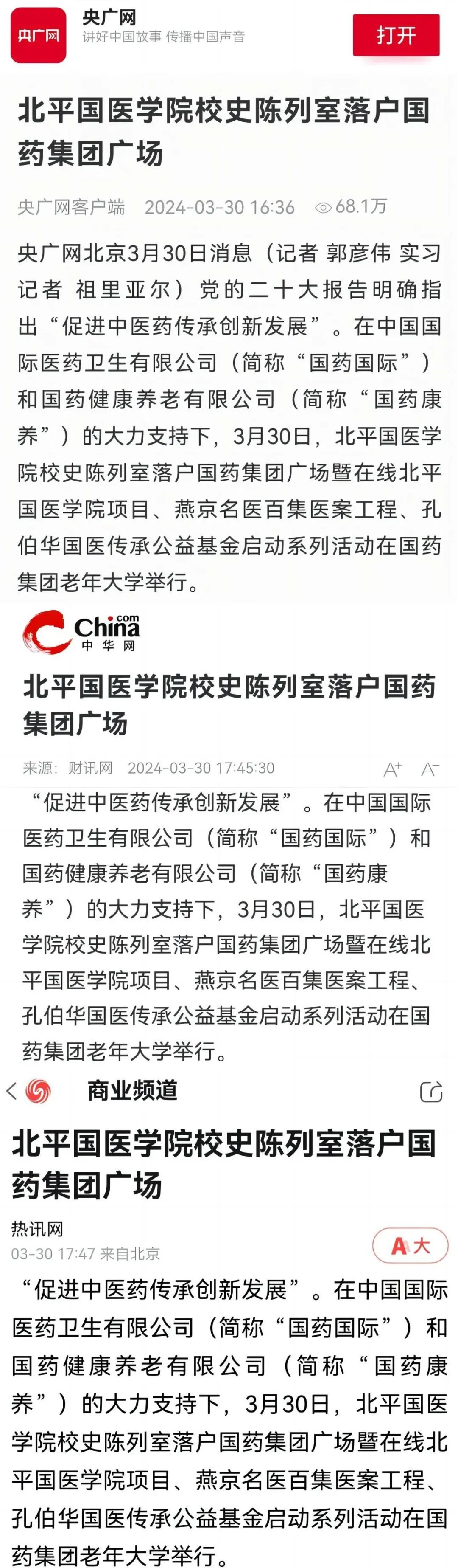 方寸之间,一览近现代中医教育历史风云。3月30日,我国华北地区首所初具规模的中医高等教育学府——北平国医学院校史陈列室落户国药集团广场,同时燕京名医百集医案工程、在线北平国医学院项目、孔伯华国医传承公益基金启动仪式在国药集团老年大学举行。