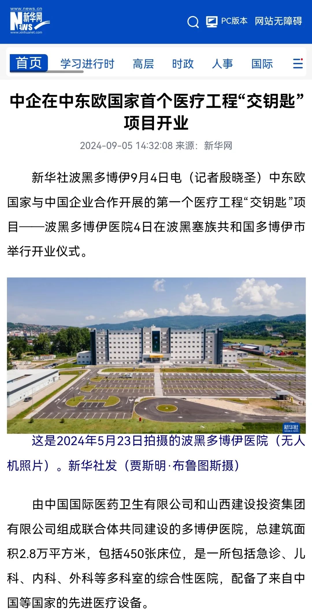 波黑当地时间9月4日,由国药集团中国国际医药卫生有限公司(简称国药国际)主导建设的波黑多博伊医院开业运营,这是中企在中东欧国家首个医疗工程“交钥匙”项目,也是第八次中国-中东欧国家领导人会晤重要成果。这所综合性医院总建筑面积2.8万平方米,床位450张,配备核磁共振成像、CT等来自中国等国家的先进设备,是当地30年来规模最大、最高标准医疗卫生项目,也是国药国际高质量建设“健康丝绸之路”和人类卫生健康共同体新亮点。
