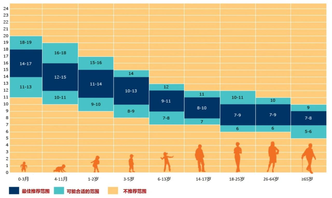 成年人每天睡眠时长理想区间7~9小时,老年人7~8小时。
