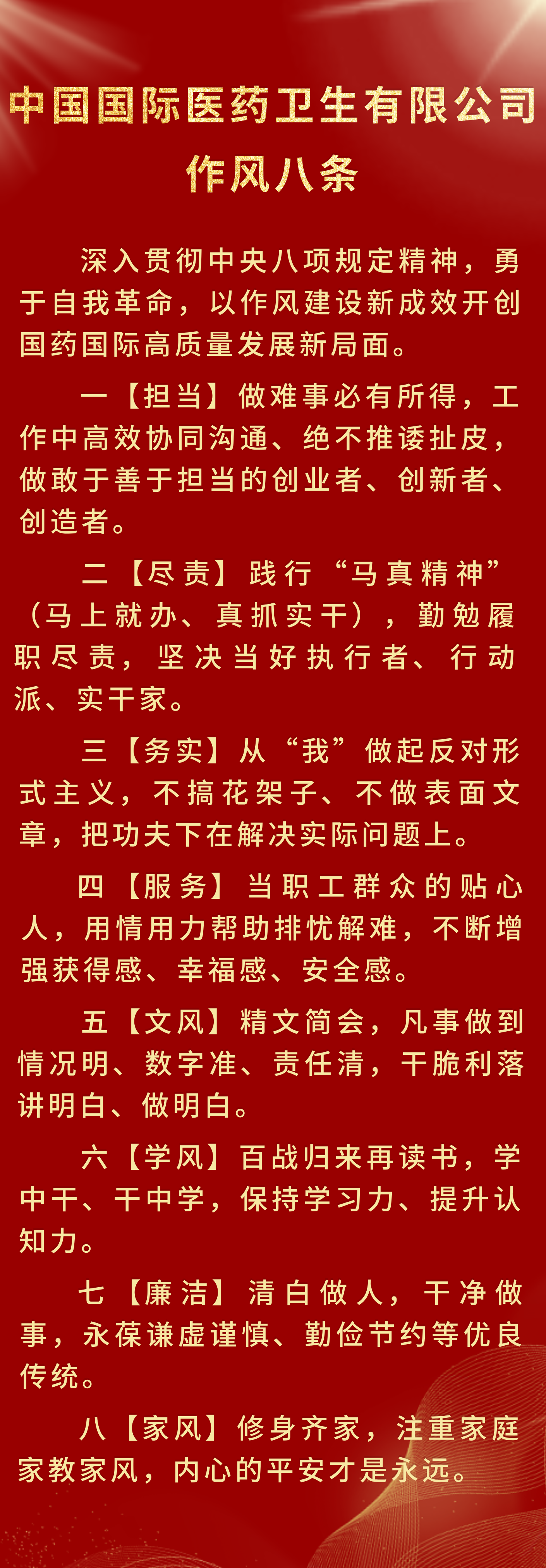 在开展深入贯彻中央八项规定精神学习教育中,国药国际广泛听取职工群众心声,共同写就“作风八条”。为立此存照、说到做到,公开发布,接受监督,持续营造风清气正的政治生态和干事创业环境。