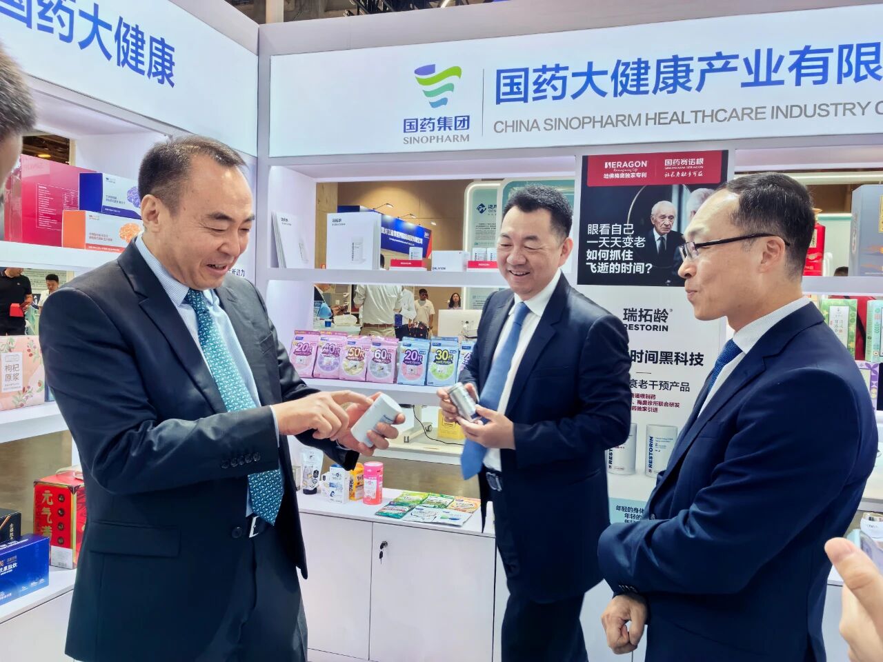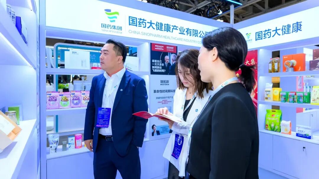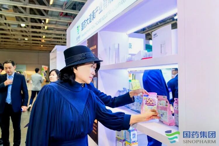 董明珠来到国药展台参观,为国药国际营养健康产品点赞。
