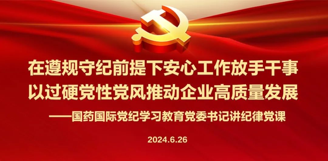 6月26日,国药国际党委书记、董事长周颂以“在遵规守纪前提下安心工作放手干事,以过硬党性党风推动企业高质量发展”为题,围绕学习贯彻习近平总书记关于全面加强党的纪律建设的重要论述和党中央决策部署,全面落实国务院国资委和国药集团党委工作要求,紧密结合国药国际改革发展党建实际,讲了一堂生动深刻、饱含真情、令人警醒的党纪学习教育专题党课。公司领导班子成员、全级次单位党员线下线上参加。