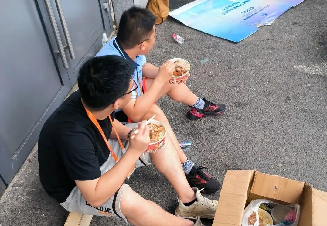 他说:“小伙伴们搭建场馆时候经常忙到中午两三点才能吃碗泡面、招待现场观众时也只能轮流简单吃上一口。未到现场的小伙伴们在公司随时待命,及时跟进后台维护,满足现场需求,为了消博会,大家都拼了!”