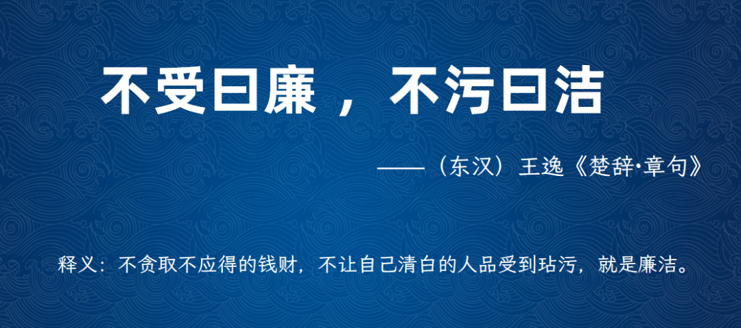 “不受曰廉、不污曰洁。”东汉著名学者王逸在《楚辞•章句》为中国历史上最早的廉洁倡导者屈原做了最好的注释。屈原明白,如果与奸佞同流合污,他一定能过上锦衣玉食的生活,但他一直坚持“宁廉洁正直以自清乎”,宁愿“伏清白以死直”也不愿折节,坚定“亦余心之所善兮,虽九死其犹未悔”的气节,最终毅然自投汨罗江,以明其高洁清廉的爱国之志。