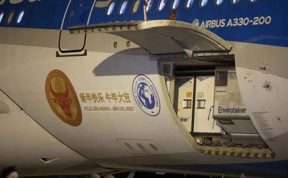 2021年2月25日,运载国药集团中国生物新冠疫苗的包机在阿根廷布宜诺斯艾利斯机场落地。阿根廷政府为表达对中国的感谢,在包机上设计了中国传统剪纸生肖牛的图案,并用中文和西班牙文在机身印上了“新年快乐 牛年大吉”字样。阿根廷总统费尔南德斯在社交媒体表示“飞机运来的不仅仅是疫苗,更是生命和希望。”