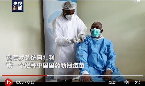 2021年3月17日,科摩罗总统阿扎利到机场迎接中国向科摩罗捐赠的国药集团中国生物新冠疫苗和防疫物资时表示“中国是以实际行动促进疫苗公平分配,彰显中非命运与共的兄弟情义”。