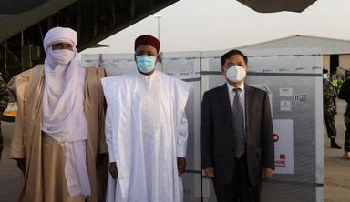 2021年3月21日,中国政府援助的国药集团中国生物新冠疫苗运抵尼日尔首都尼亚美迪奥里•哈马尼国际机场。尼日尔总统伊素福、总理拉菲尼等赴机场迎接。
